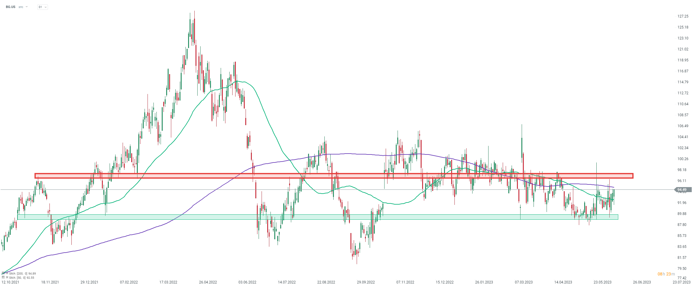 Bunge (BG.US) cotiza ligeramente a la baja tras la noticia de la fusión de Viterra. Las acciones iniciaron la negociación de hoy con una pequeña brecha de precios bajista y se movieron aún más a la baja en los primeros minutos de negociación. Sin embargo, los alcistas ya lograron recuperarse de esta caída. Fuente: xStation5