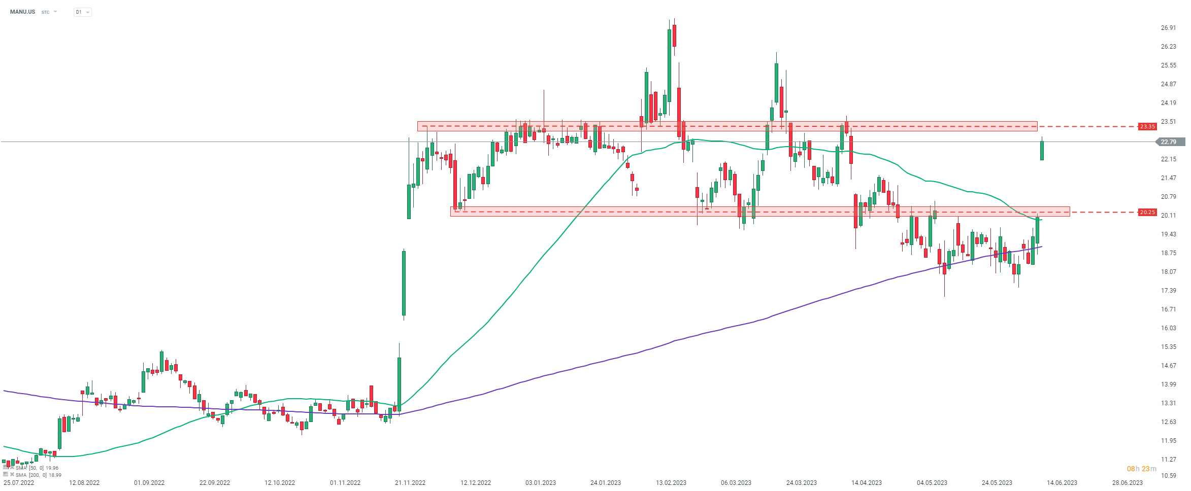 El Manchester United (MANU.US) sube más del 12% tras la noticia de una oferta del qatarí Sheikh Jassim. Las acciones se acercan a una zona de resistencia de $ 23.35, nivel que no se ve desde mediados de abril de 2023. Fuente: xStation5
