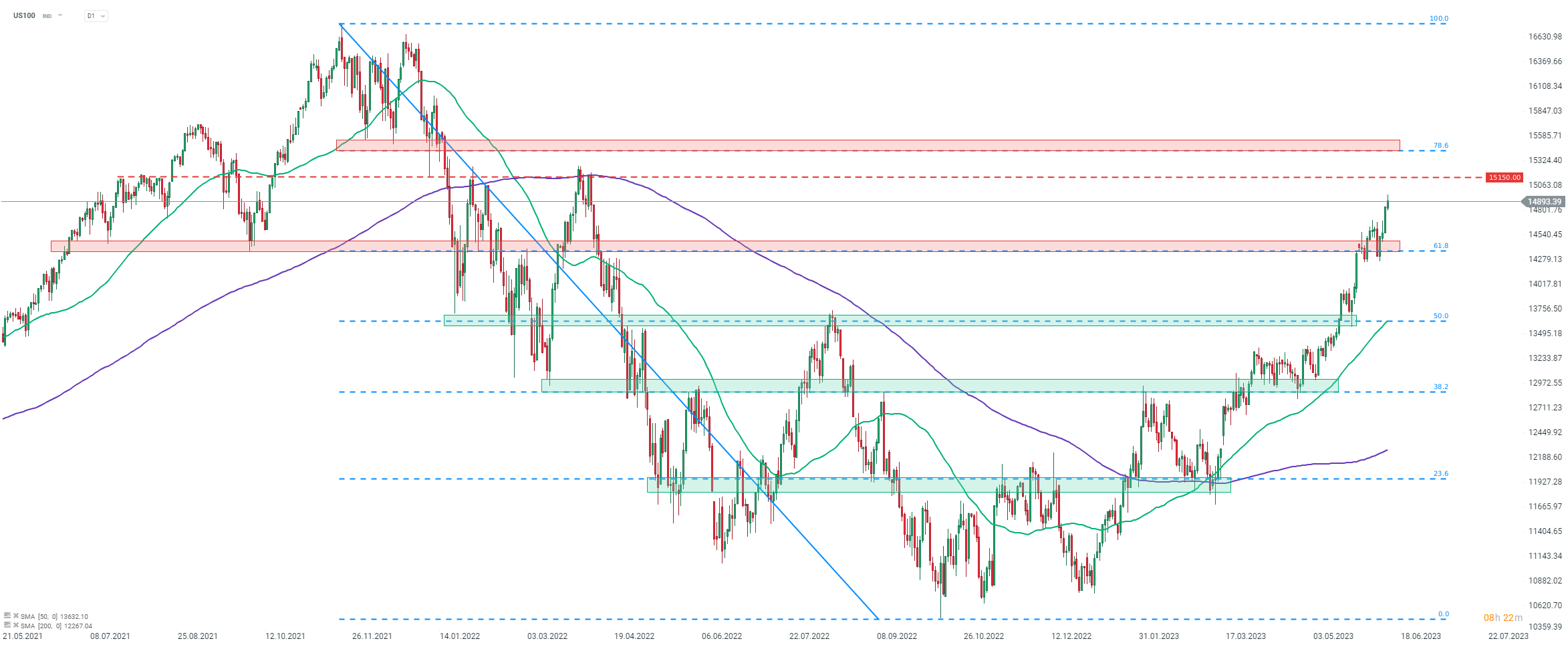El índice tecnológico estadounidense Nasdaq-100 (US100) es uno de los índices de Wall Street con mejor desempeño al comienzo de la sesión de transacciones en efectivo de hoy. No debería ser una sorpresa dado que las acciones tecnológicas tienden a ser más reactivas a los cambios en las expectativas de las tasas de interés de EE. UU. a corto plazo, y que cayeron después de la publicación de los datos del IPC de EE. UU. El índice cotiza casi un 1% más y se acerca a una marca psicológica de 15.000 pts. Si prevalece el sentimiento optimista, la resistencia a observar de corto plazo se puede encontrar en el área de 15.150 pts, marcada con máximos locales de febrero y marzo de 2022. Por otro lado, si los bajistas ganan control sobre el mercado y se lanza un retroceso, el El primer nivel de soporte a observar se encuentra por encima del 61,8% de retroceso (área de 14.350 pts).