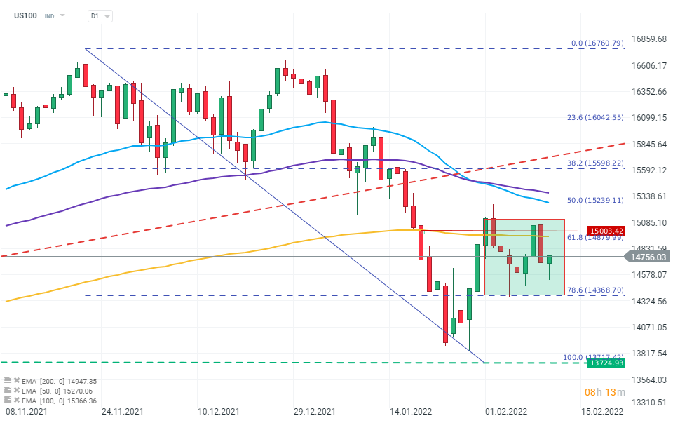 Gráfico de índice US100, intervalo D1. La mayoría de los índices de Wall Street continúan operando en un área de consolidación de oferta y demanda. El índice de empresas tecnológicas intenta actualmente subir y atacar el nivel de resistencia marcado por el retroceso del 61,8%, la EMA 200 (línea dorada) y la barrera psicológica de los 15.000 puntos. El soporte local se mantiene en la zona cercana a los 14.400 puntos, lo que coincide con el retroceso del Fibonacci del 78,6%. Fuente: xStation 5