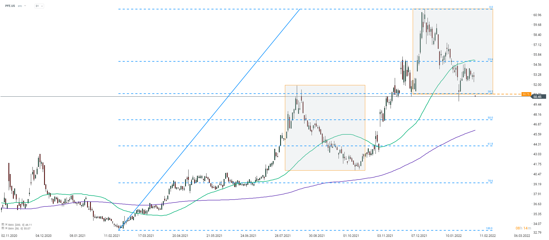 Pfizer (PFE.US) está recibiendo un golpe a pesar de publicar un informe trimestral sólido. Las acciones cotizan cerca de un nivel de soporte clave: combinación del límite inferior de la estructura de sobrebalance y un retroceso del 38,2 % del impulso alcista lanzado en marzo de 2021 (área de $50,75). Romper y terminar el día por debajo de este soporte podría insinuar que se avecina una mayor debilidad de la acción, ya que la ruptura por debajo de la estructura de sobrebalance sugiere un posible cambio de tendencia. Fuente: xStation5