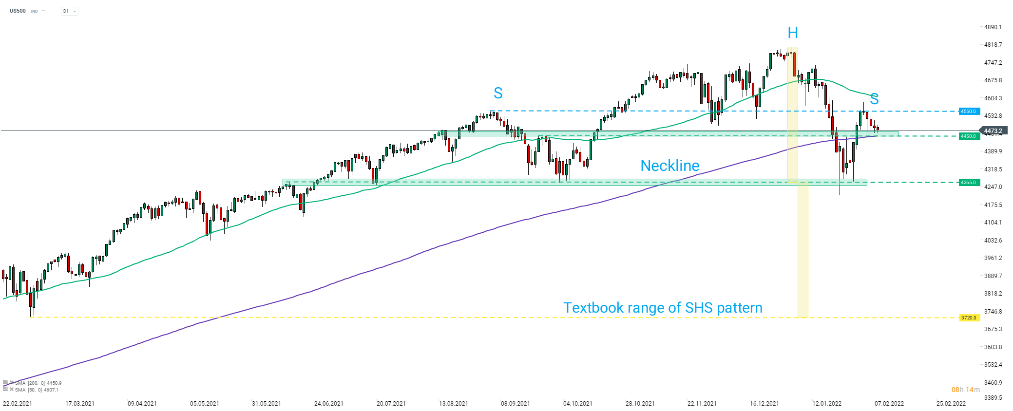 S&P 500 (US500) detuvo el movimiento de recuperación la semana pasada y comenzó a moverse a la baja. Un punto a destacar es que el mínimo local reciente coincidió con un mínimo local de principios de septiembre de 2021 (área de 4,550 pts). Además, el mínimo local reciente coincidió con un mínimo local de principios de octubre de 2021 (área de 4,265 pts). Como resultado, apareció en el gráfico un posible patrón de cabeza y hombros. Si el US500 cae por debajo del soporte de 4,450 pts, el camino hacia la línea de cuello del patrón en 4,265 pts quedará abierto. Romper por debajo de este obstáculo podría desencadenar una caída al área de 3,720 pts si el rango del patrón se ejecuta de la manera de un libro de texto.