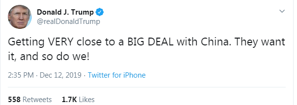 Donald Trump acaba de tuitear que el acuerdo comercial con China está cerrado y que ambas partes lo esperan. No es el primer tweet de este tipo en los últimos meses, pero esta vez es importante ya que los mercados estaban buscando respuestas antes de la fecha límite del 15 de diciembre para aranceles adicionales. Los índices se disparan en respuesta, US500 acaba de sobrepasar máximos históricos.