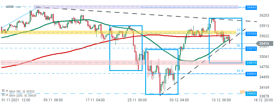 US30 abrió la sesión de hoy a la baja y rompió por debajo de la línea de tendencia alcista que coincide con 50 SMA (línea verde). Si prevalece el sentimiento actual, el movimiento a la baja puede extenderse hasta el nivel de 35275 pts, que se ve reforzado por el 38.2% de retroceso de Fibonacci de la onda ascendente lanzada en octubre de 2020 o incluso el soporte en 34870 pts, que está marcado con un límite inferior de la estructura 1: 1. Fuente: xStation5