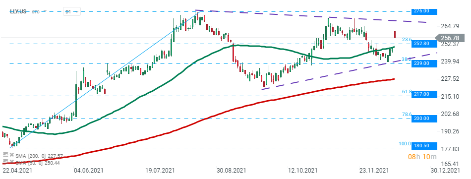 Las acciones de Eli Lilly (LLY.US) abrieron la sesión de hoy con un gap alcista y actualmente se negocia por encima del soporte local en los 252.80 $ que coincide con el 23.6% de retroceso de Fibonacci de la ola ascendente lanzada a fines de abril de 2021. Si el sentimiento actual prevalece, el El movimiento alcista puede acelerarse hacia un máximo histórico de los 276,00 $. Fuente: xStation5