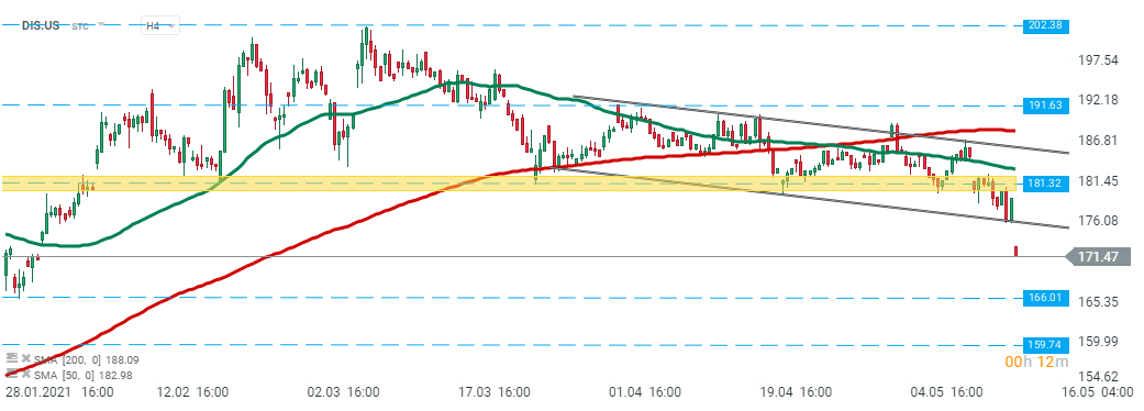 Walt Disney (DIS.US) : ayer las acciones se negociaban bajo presión a pesar del sentimiento general positivo, pero los compradores lograron detener las caídas en el límite inferior del canal descendente. Hoy, se puede ver que el movimiento alcista continúa después de la apertura de EE. UU. Las acciones comenzaron a cotizar con un enorme gap bajista , si prevalece el sentimiento actual, el soporte de los 166.01 $ puede estar en riesgo. Por otro lado, la resistencia principal más cercana se encuentra en 181,32. Fuente: xStation5