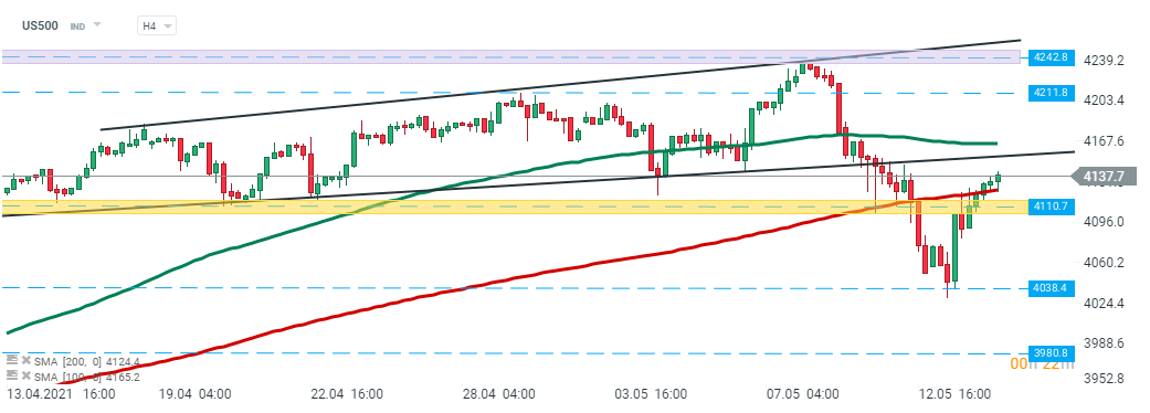 US500 logró romper por encima de la resistencia principal en 4110.7 pts y 200 SMA (línea roja). El próximo objetivo para los alcistas se ubica en 4211.8 pts, sin embargo, los compradores anteriores tendrán que lidiar con el límite inferior previamente roto del canal ascendente y 50 SMA (línea verde). Si los compradores no logran romper por encima, entonces se puede lanzar otro impulso a la baja hacia el nivel de 4110.7 pts mencionado anteriormente. Fuente: xStation5