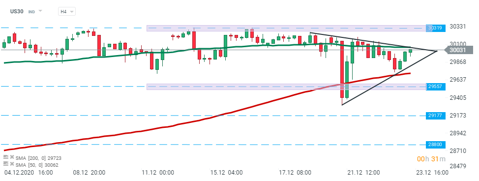US30 : el índice abrió la sesión de hoy al alza y se acerca al límite superior del patrón de triángulo que coincide con el 50 SMA (línea verde). Si prevalecen los estados de ánimo optimistas, la resistencia en 30,319 ptos puede entrar en juego. Fuente: xStation5