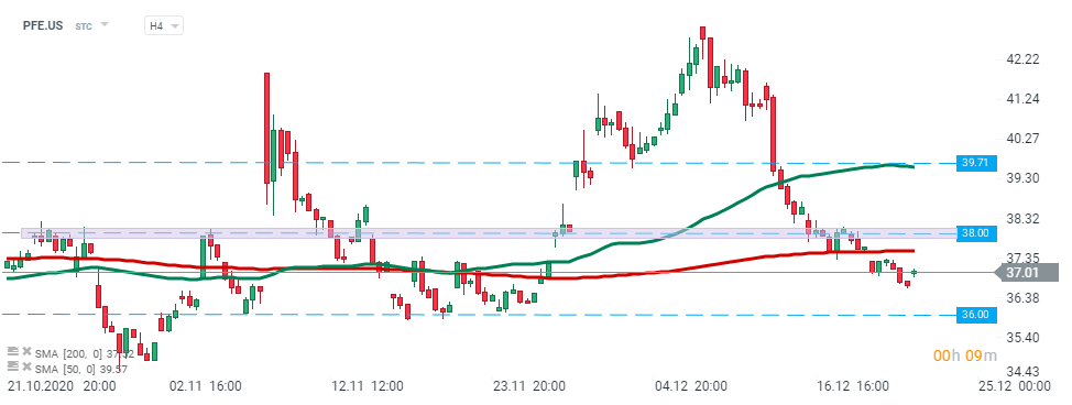 Las acciones de Pfizer (PFE.US) abrieron la sesión de hoy al alza después de que la compañía anunció un segundo acuerdo con el gobierno de EE. UU. con respecto a la vacuna Covid-19. Si prevalece el sentimiento actual, el movimiento alcista podría extenderse hasta el nivel de 38,00 dólares. Por otro lado, si los vendedores logran recuperar el control, se podría lanzar otro impulso a la baja hacia $ 36.00. Fuente: xStation5