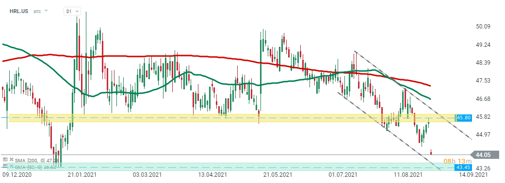 Las acciones de Hormel (HRL.US) abrieron la sesión de hoy con un gap bajista y se están acercando al límite inferior del canal descendente que coincide con el soporte en 43.45 $ donde se ubican los mínimos de enero. Si ocurre una ruptura más baja, entonces la corrección a la baja puede acelerarse. Por otro lado, si los compradores logran recuperar el control, entonces se puede lanzar otro impulso alcista hacia la resistencia en 45.80 $. Fuente: xStation5