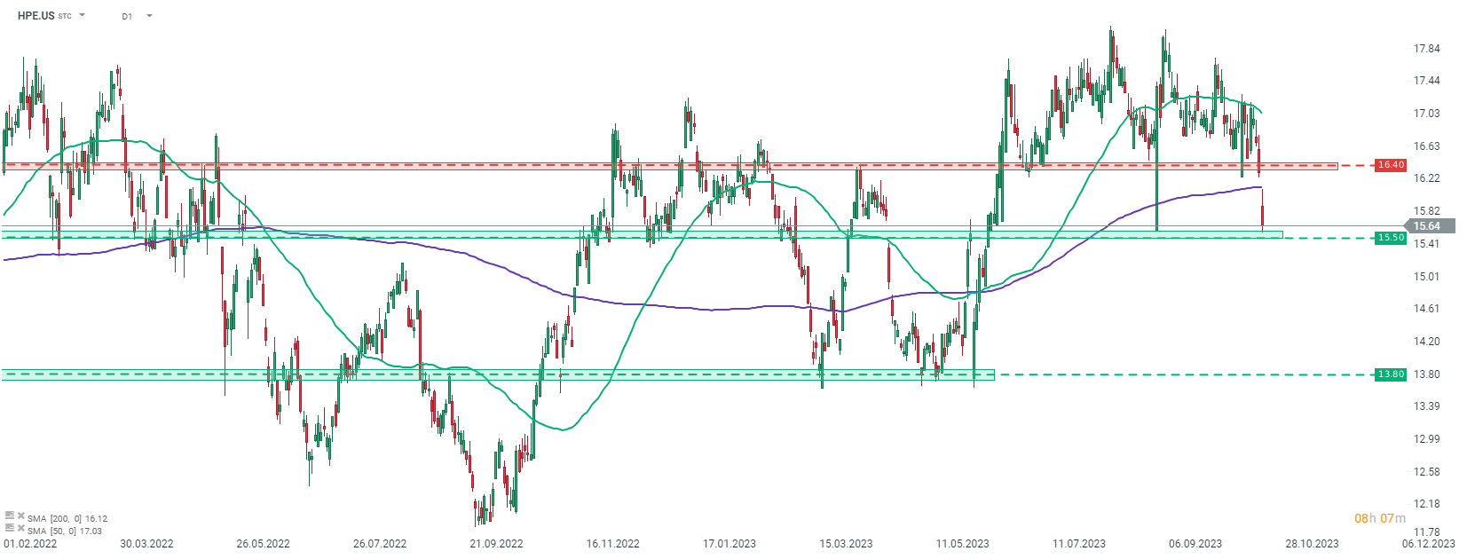 HP Enterprise (HPE.US) empezó cayendo hoy tras unos pronósticos de ganancias decepcionantes. Las acciones cayeron por debajo de la media móvil de 200 sesiones (línea violeta) y continuaron bajando más adelante. Se probó la zona de soporte en el área de $ 15,50, pero aún no se produjo ninguna ruptura por debajo.