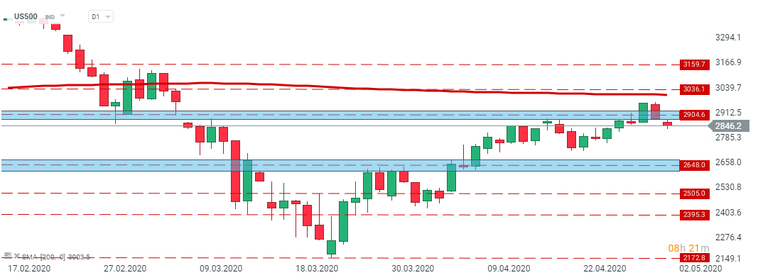 S & P500 (US500) cayó por debajo de 2900 pts debido al sentimiento negativo que prevalece en los mercados. Si la tendencia actual continúa, entonces el índice puede dirigirse hacia el soporte ubicado en 2648.0. Sin embargo, en caso de una ruptura más alta, la próxima resistencia a mirar se ubica en 3036.1 pts. Fuente: xStation5