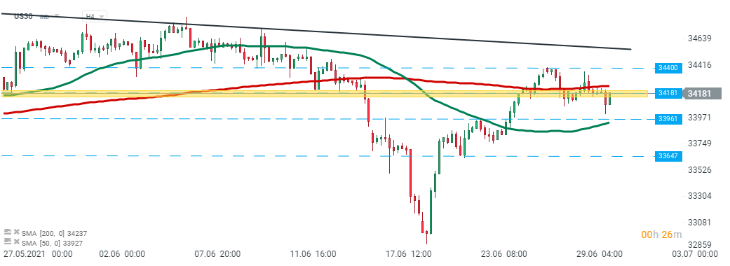 US30 rompió por debajo del soporte principal en 34181, que ahora actúa como resistencia. La nueva prueba del nivel antes mencionado se lleva a cabo en este momento y si los compradores logran romper más alto, el movimiento ascendente puede reanudarse. El próximo objetivo para los alcistas se ubica en 34400 pts. Sin embargo, mientras el precio se mantenga por debajo de él, el escenario base es un movimiento a la baja. El soporte más cercano se encuentra en 33961 pts. Fuente: xStation5