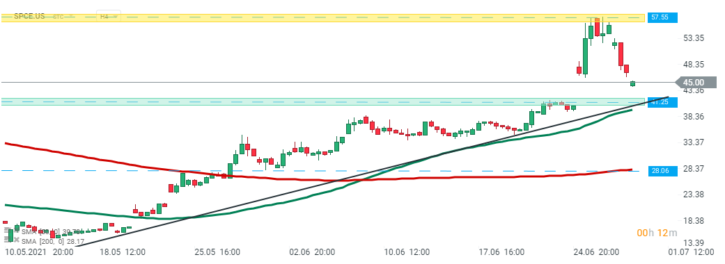 Las acciones de Virgin Galactic (SPCE.US)abrieron la sesión de hoy a la baja y se dirigen hacia el límite inferior de la brecha de precios alcista en $ 41.25, que se ve reforzada por 50 SMA (línea roja) y la línea de tendencia ascendente. Si se produce una ruptura a la baja, el movimiento a la baja puede acelerarse hacia el soporte en $ 28.06. Por otro lado, si los compradores logran detener las caídas, entonces se puede lanzar otro impulso alcista hacia la resistencia en $ 57,55. Fuente: xStation5