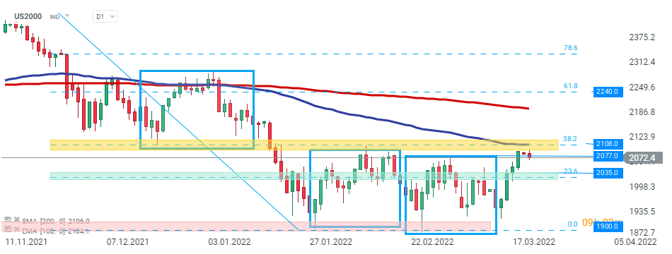 US2000: la semana pasada, los compradores lograron superar la resistencia local en 2035 pts, lo que coincide con un retroceso de Fibonacci del 23,6% de la última ola bajista. Actualmente, los alcistas del mercado están probando una zona de resistencia importante entre 2077 pts y 2108 pts, que está marcada con el límite superior de la estructura 1:1, reacciones de precios anteriores, retroceso del 38,2 % y EMA 100 (línea morada). Mientras el precio se mantenga por debajo, se puede reanudar el movimiento a la baja. Fuente: xStation5