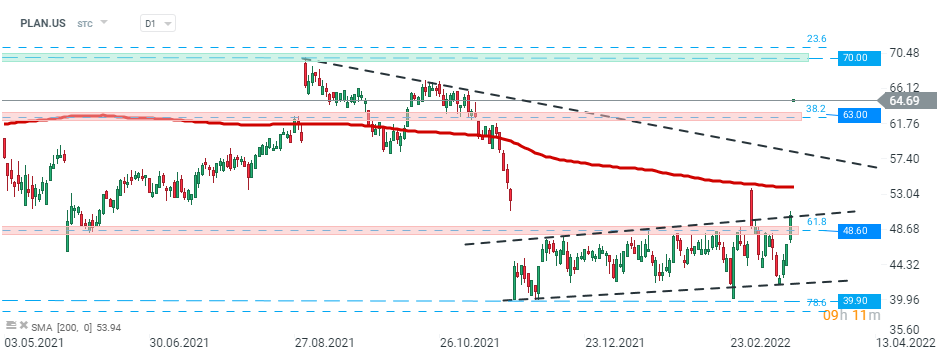 Las acciones de Anaplan (PLAN.US) se iniciaron en la sesión de hoy con una brecha de precios alcista y actualmente cotizan por encima del soporte principal en $ 63.00, lo que coincide con el retroceso de Fibonacci del 38.2% de la ola alcista iniciada en abril de 2020. Si prevalece el sentimiento actual, el movimiento alcista puede acelerarse hacia resistencia a $70.00. Fuente: xStation5