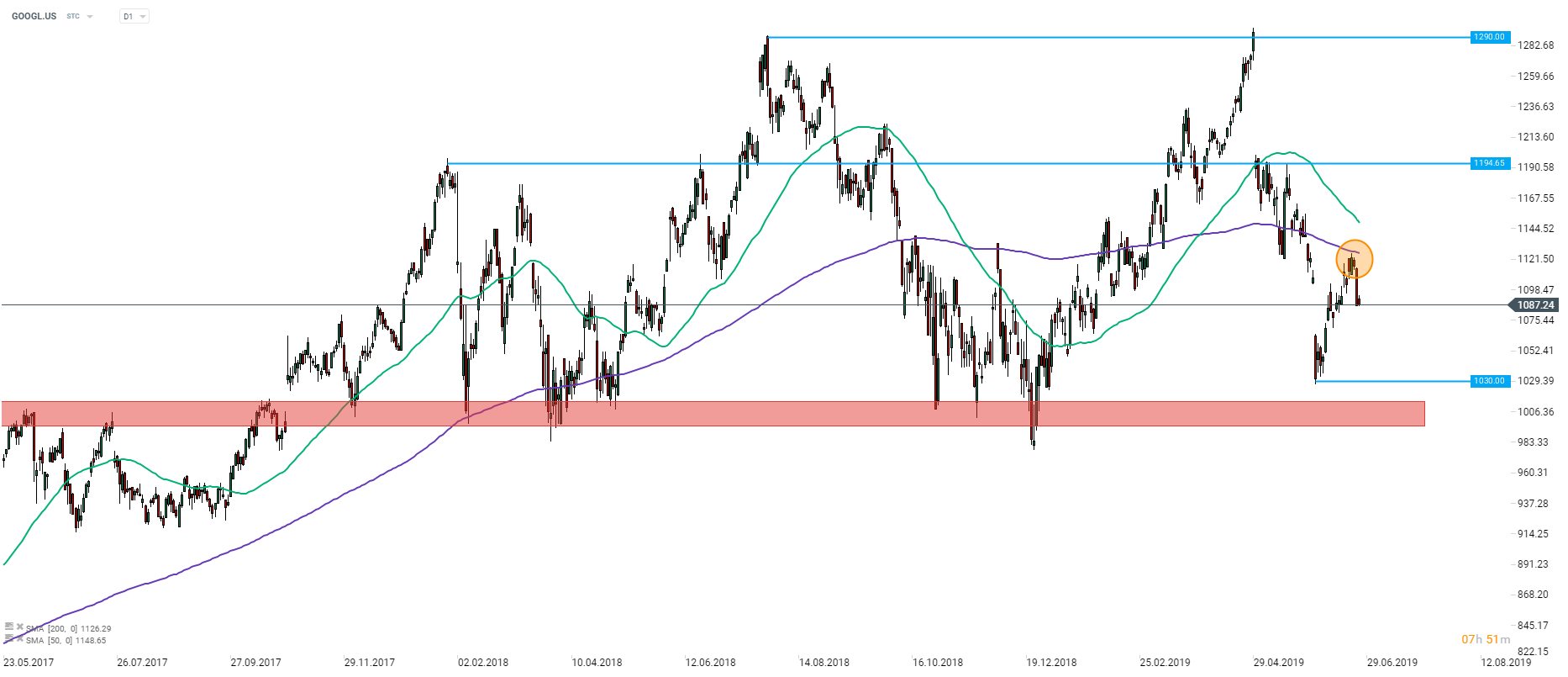 Alphabet (GOOGL.US) probó la zona de soporte en alrededor de $ 1000 algunas veces durante los últimos 2 años y, después de cada prueba, logró imprimir un nuevo ATH un tiempo después. Sin embargo, el último rebote del asa de $ 1030 se detuvo por el promedio móvil de 200 sesiones (línea morada) y la acción volvió a disminuir y amenazó con finalizar la recuperación. Fuente: xStation5