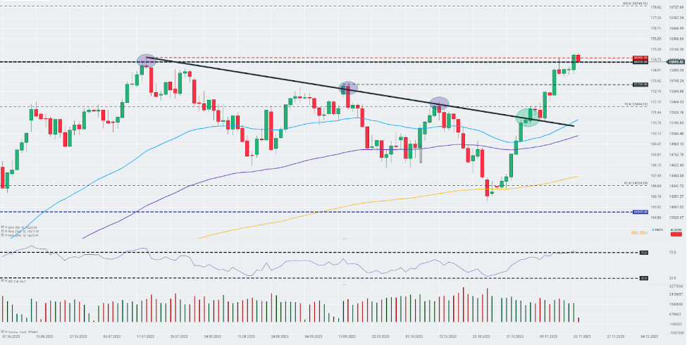 El NASDAQ comienza la sesión de hoy a la baja y se acerca a la zona psicológica de los 16.000 puntos, que después de la ruptura de ayer es ahora la zona de soporte más importante. La zona de 16.060 puntos (picos locales de la segunda quincena de julio de 2023) es ahora la estructura de resistencia más importante para el Nasdaq; ayer el índice de referencia probó esta zona y logró cerrar el cuerpo superior de la vela D1 por encima de esta barrera.