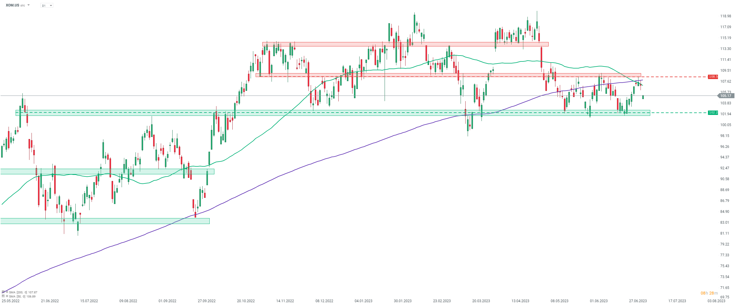 Exxon Mobil (XOM.US) cae hoy después de emitir una advertencia de beneficios para el segundo trimestre de 2023. Las acciones retroceden después del intento fallido de superar la zona de resistencia de 108,50 $. Si los bajistas mantienen el control, las acciones pueden mirar hacia el soporte de 102,25 $ que marca el límite inferior de un rango de negociación reciente. Fuente: xStation5