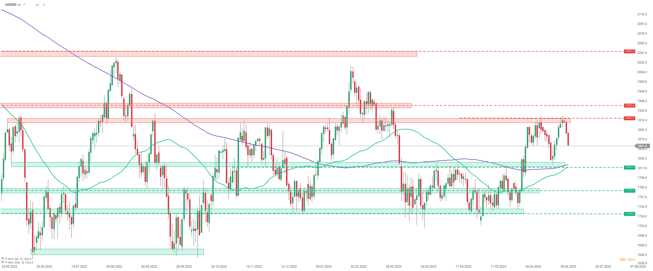 El Russell 2000 de pequeña capitalización (US2000) es uno de los índices de Wall Street con peor desempeño en los últimos tiempos. Si bien el índice logró recuperarse de las caídas que ocurrieron durante la primera quincena de junio, después una vez más no logró romper por encima de la zona de resistencia de 1.915 pts. Como resultado, se pintó el doble techo en el gráfico. El soporte del patrón se puede encontrar en el área de 1.820 pts y una ruptura por debajo de esta zona allanaría el camino para una caída más profunda. Por otro lado, cabe señalar que la secuencia de mínimos más altos todavía está presente en el gráfico y, por lo tanto, la estructura de tendencia alcista aún no se ha roto.
