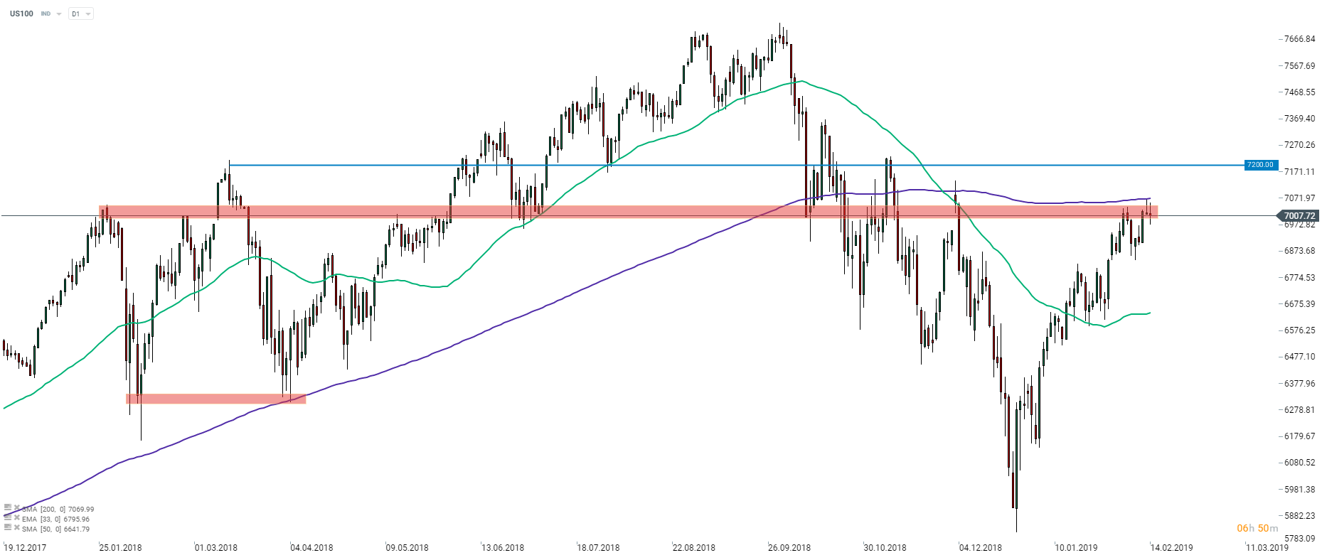Nasdaq (US100) continúa luchando dentro de la zona de resistencia que se extiende por encima de los 7000 pts. Fuente: xStation5