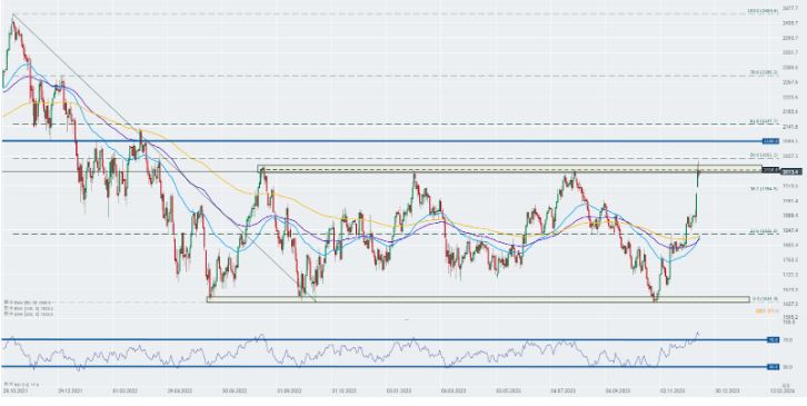 El índice Russell 2000 cotiza actualmente en una zona de resistencia clave definida por los picos locales de 2023. Una ruptura firme por encima de esta estructura podría conducir a nuevos repuntes hacia la barrera establecida por el retroceso de Fibonacci del 50% de la onda descendente iniciada el 11 de noviembre de 2021. Por otro lado, ahora podemos considerar el retroceso Fibonacci del 38,2% de la onda bajista mencionada anteriormente como la principal región de soporte.