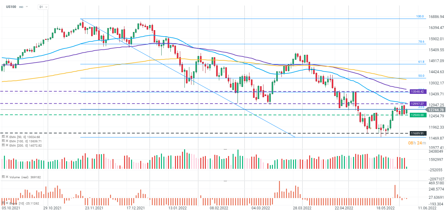 Gráfico de índice US100, intervalo D1. El índice de referencia de los blue chips tecnológicos de EE. UU. comienza la sesión de hoy con ganancias, pero aún se encuentra dentro de la zona de consolidación entre los 12500 y los 13000 puntos. La resistencia en 13000 puntos ahora se ve reforzada por la media móvil exponencial de 50 días (curva azul). Fuente: xStation 5
