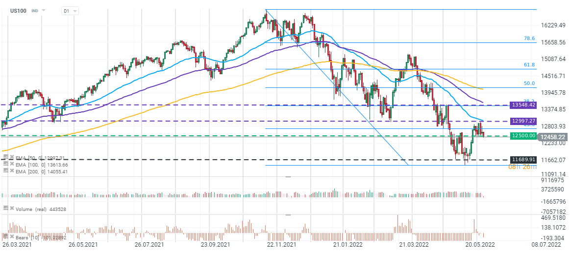 US100, intervalo D1. El benchmark de las empresas tecnológicas arrancó la sesión de hoy con descensos que, sin embargo, van perdiendo intensidad y han probado resistencia en el nivel de los 12.500 puntos. Por el momento, la clave parece ser cómo reaccionarán los precios de las acciones a este nivel. Una ruptura sostenida a la baja puede desencadenar la activación del lado de la oferta. Por otro lado, una ruptura por encima de este nivel mantendrá el movimiento alcista que ha estado ocurriendo desde finales de mayo. Fuente: xStation 5