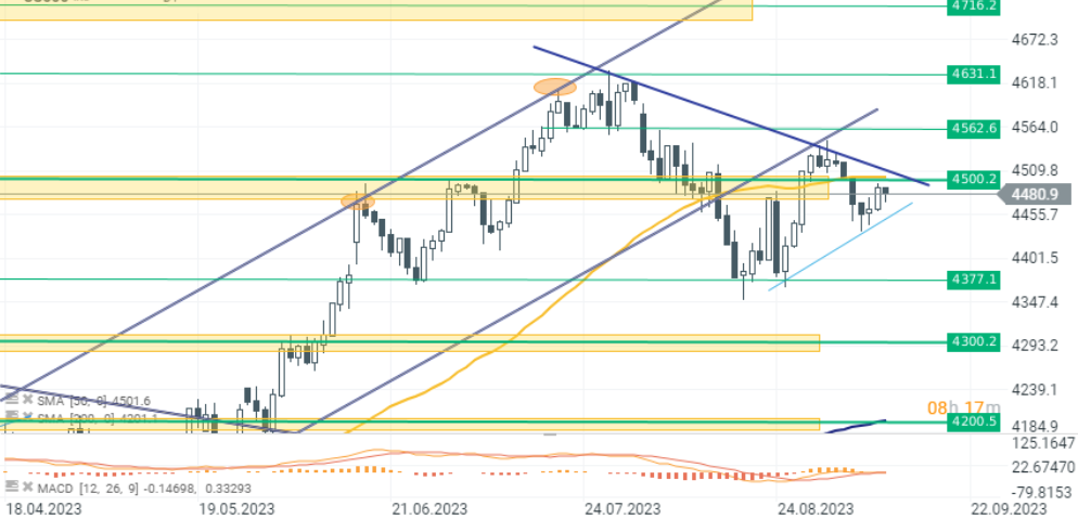 El precio del índice S&P 500 se encuentra actualmente en 4480 puntos, lo que refleja una caída del 0,20% con respecto a sus niveles de ayer. El índice ha retrocedido desde un punto de resistencia fundamental en 4500 puntos y parece estar bajando. No superar esta resistencia podría intensificar la presión de venta, lo que podría hacer bajar el precio del S&P 500. En este escenario, el siguiente soporte crucial se encuentra en el rango de 4380-4400 puntos. En particular, la reciente corrección ha creado una nueva línea de tendencia bajista, marcada por dos picos locales (indicados por la línea azul), que podría ser la trayectoria del nuevo índice. Los operadores deberían seguir de cerca la evolución de estos niveles clave en busca de posibles señales de dirección del mercado. Fuente xStation 5