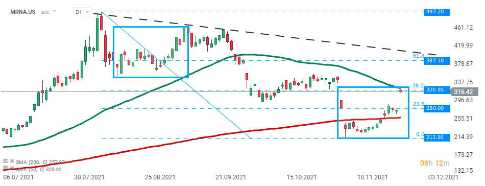 Las acciones de Moderna (MRNA.US)abrieron la sesión de hoy con un gap alcista y están probando resistencia en los 320.85 $ que coincide con el límite superior de la estructura 1: 1, 50 SMA (línea verde) y 38.2% de retroceso de Fibonacci de la última ola bajista . Si prevalece el sentimiento actual, el movimiento alcista puede acelerarse hacia la resistencia en $ 387.10 que coincide con una línea de tendencia a la baja y un retroceso de Fibonacci del 61.8%. Por otro lado, si los vendedores logran recuperar el control, el soporte más cercano se encuentra en $ 280,00 y se fortalece con un 23,6% de retroceso de Fibonnaci. Fuente: xStation5