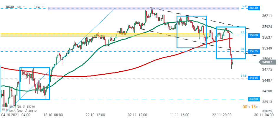 US30 rompió por debajo del límite inferior de la formación de la cuña y el límite inferior de la estructura 1: 1. Si prevalece el sentimiento actual, el movimiento bajista puede acelerarse hacia el soporte 34565 pts que coincide con el 61.8% de retroceso de Fibonacci de la última ola alcista. Fuente: xStation5