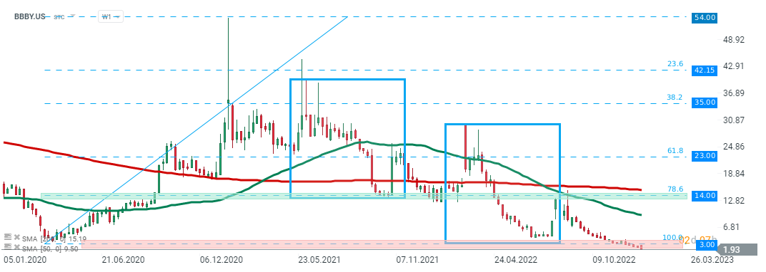 Las acciones de Bed Bath & Beyond Inc (BBBY.US) cayeron por debajo del mínimo histórico de $3,00 y entraron en terreno desconocido. Fuente: xStation5