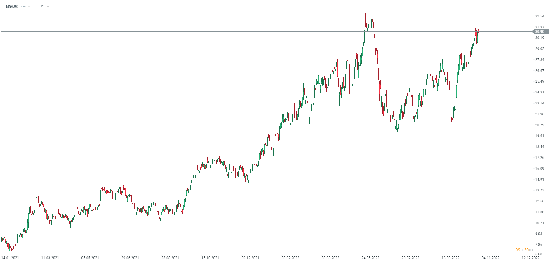 Marathon Oil ha subido ligeramente hoy tras un buen informe financiero. Por otro lado, es solo una recuperación tras la caída de ayer provocada por la idea de Biden sobre el impuesto a los beneficios extraordinarios. Fuente: xStation5
