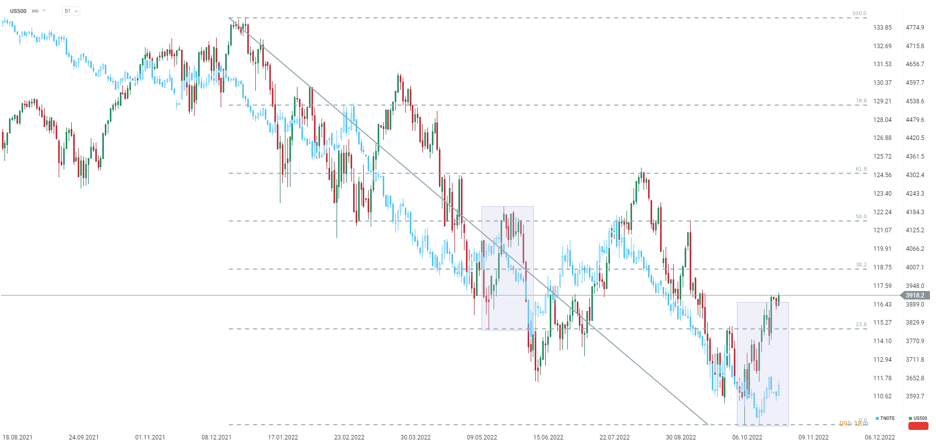 El US500 continúa con un fuerte repunte que comenzó el viernes y cotiza en su nivel más alto desde el 21 de septiembre. Podemos notar una ligera caída en los rendimientos, aunque todavía es demasiado pequeño para indicar que esto ya es un cambio permanente en la perspectiva del mercado. Por supuesto, vale la pena recordar que, estadísticamente, el US500 había estado sumando durante el mes de las elecciones de mitad de período. Por otro lado, si la Fed mantiene su retórica actual y no cambia su postura sobre una mayor reducción del balance, podría significar que el repunte actual es otra corrección en la tendencia bajista.