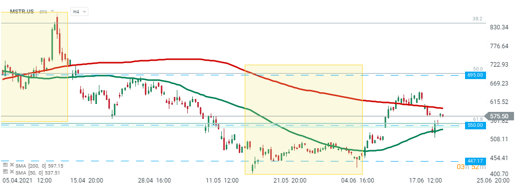 MicroStrategy (MSTR.US) : ayer los compradores lograron detener las caídas en 50 SMA (línea verde) y el precio regresó por encima del soporte principal en $ 550.00, que coincide con el retroceso de Fibonacci de 61.8 de la onda ascendente que comenzó en marzo de 2020. Si el sentimiento actual prevalece y se produce una ruptura por encima de 200 SMA (línea roja), luego el próximo objetivo para los alcistas se ubica alrededor de $ 695.00 y está marcado por el límite superior de la estructura 1: 1 y el retroceso de Fibonacci 50.0. Fuente: xStation5