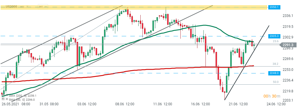 US2000 : el índice rebotó en la línea de tendencia alcista y actualmente está probando la resistencia local alrededor de 2305 pts, que está marcada con un retroceso de Fibonacci de 23.6 de la reciente ola alcista y 50 SMA (línea verde). Si se produce una ruptura al alza, se puede lanzar otro impulso alcista hacia el máximo histórico en 2350 pts. Por otro lado, si los vendedores logran romper por debajo de la línea de tendencia antes mencionada, entonces el soporte en 2248 pts puede estar en riesgo. Fuente: xStation5
