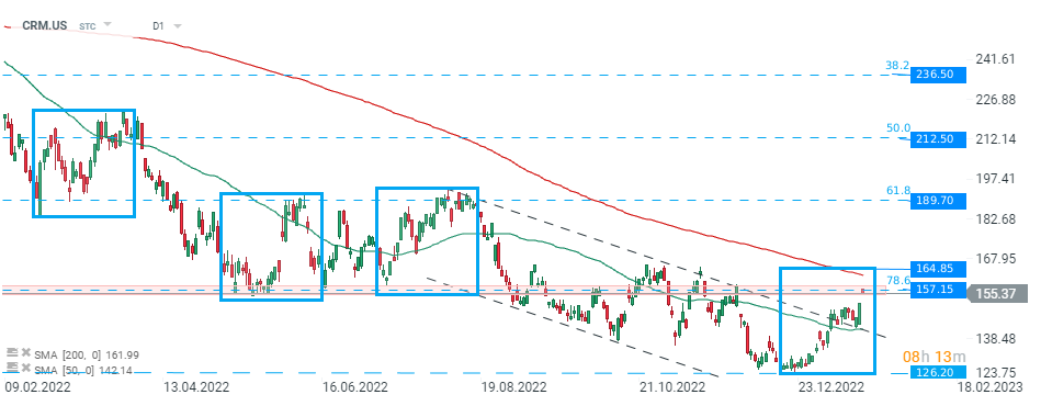Las acciones de Salesforce (CRM.US) comienzan en la sesión de hoy con un hueco alcista y están probando un retroceso de Fibonacci del 78,6 % de la ola alcista lanzada en marzo de 2020. Si los compradores logran romper al alza, la próxima resistencia local se puede encontrar en $164,85. Este nivel está marcado con un límite superior de la estructura 1:1 y 200 SMA (línea roja). Si los alcistas logran romper más alto, entonces el movimiento alcista puede acelerarse hacia la próxima resistencia en USD 189,70. Fuente: xStation5