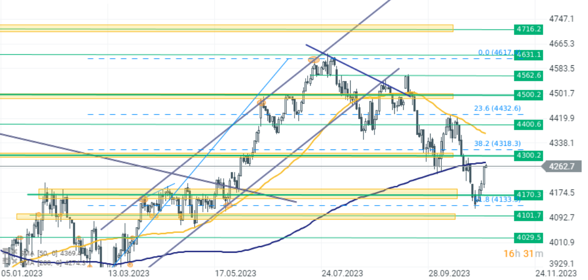 El S&P500 ganó ayer un 1,60% más, dirigiéndose hacia la siguiente zona de resistencia en 4.300 puntos. Se defendió el precio del índice en el nivel de retroceso de Fibonacci del 61,8% y el rebote se aceleró tras la decisión de la Reserva Federal.