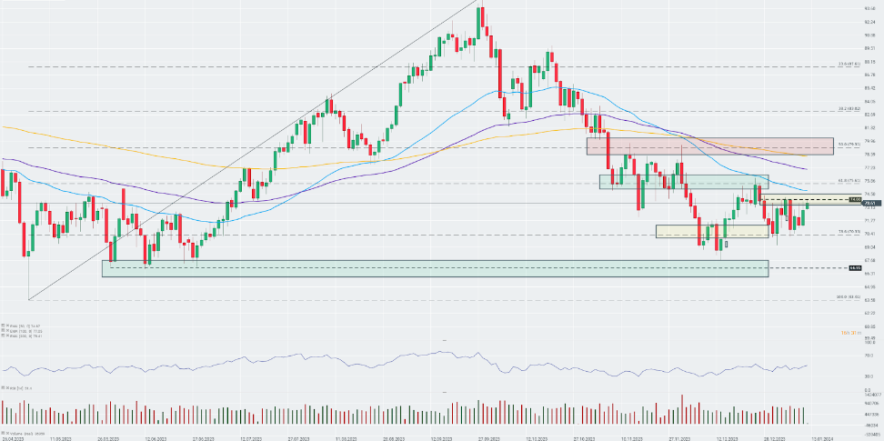 Los atentados en Oriente Medio y la incierta situación del transporte marítimo en esa zona están apoyando hoy los precios del crudo Brent, que intenta probar el límite superior de la consolidación en 74 dólares por barril.