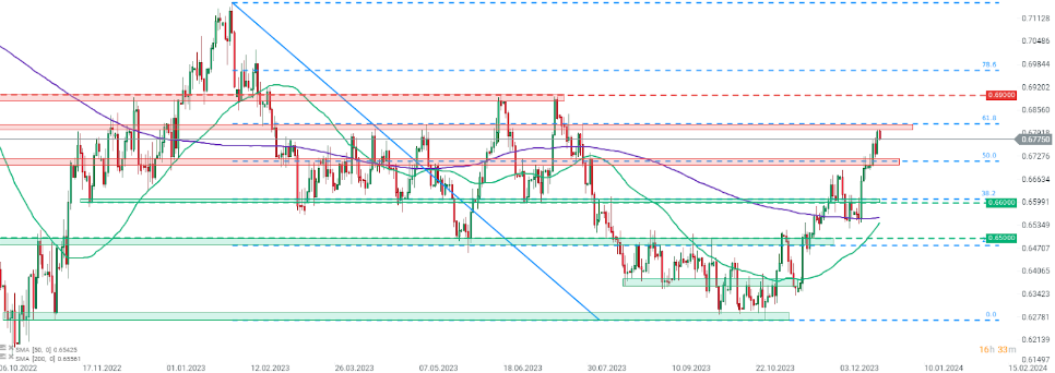 El AUDUSD subió a su nivel más alto desde finales de julio de 2023, pero los alcistas no lograron superar la zona de resistencia que se encuentra por debajo del 61,8% de retroceso del movimiento a la baja lanzado a principios de febrero de 2023. Hoy cede ligeramente.