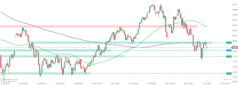 El barril de Brent continúa cayendo tras no poder superar la zona de resistencia de los 82,50$, marcada con el promedio móvil de 200 sesiones (línea morada).