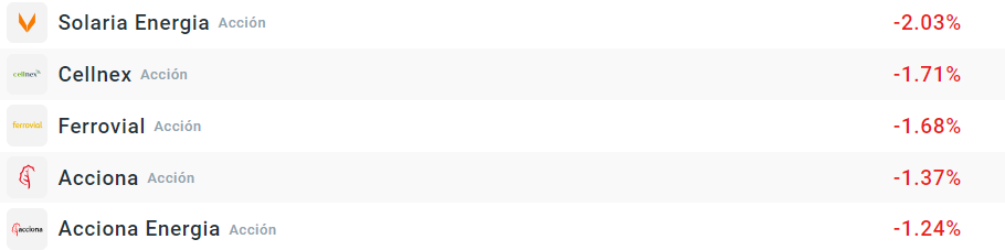 Repsol es la empresa que mejor comportamiento está teniendo hoy, después de que ayer conociéramos la adquisición completa de su filial de renovables en Chile. Le sigue Rovi, que también empieza el trimestre con buenas noticias y es que su fármaco para la esquizofrenia ha recibido el visto bueno de la agencia americana. Por la parte bajista tenemos a Solaria. La compañía sigue repitiendo como la que peor comportamiento tiene y le siguen empresas como Acciona y Acciona Energía, que también son habituales. Los bajos precios de la luz están impactando las perspectivas de los inversores sobre estas empresas.