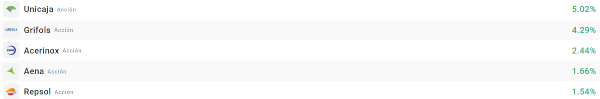 A nivel empresarial, Unicaja lidera las subidas con casi un 5% arriba tras presentar sus resultados. Le sigue Grifols, que ayer anunció una reorganización de su cúpula directiva y sus ADR en Estados Unidos ya apuntaban a una subida. Acerinox cierra el top 3, debido al anuncio de adquisición de una compañía americana y que ya provocó subidas en la sesión de ayer. Las compañías que más caen son las energéticas, que llevan todo el 2024 moviéndose en tándem.