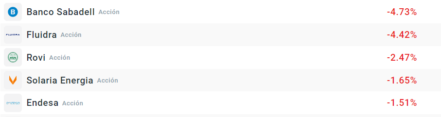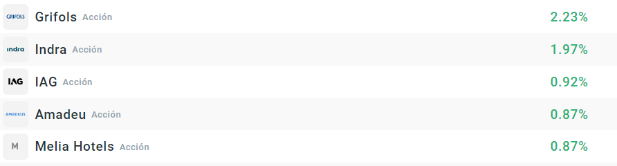 Las subidas están lideradas por Grifols, que sigue con el optimismo generado por la confirmación de la venta de parte de su filial china, que se realizará en junio a falta de confirmación de la bolsa de esa región. Indra también arrastra las subidas de sus grandes resultados. Las caídas han están protagonizadas por Banco Sabadell, Rovi y Fluidra. Estas dos últimas por unos malos resultados, mientras que Sabadell sigue cayendo tras la negativa a BBVA.