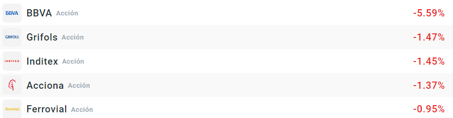 Las subidas de hoy están protagonizadas por Banco Sabadell, que sube tras la OPA hostil lanzada por BBVA y que valoraría a sus acciones en torno los 2,25€. Le sigue Fluidra, que rebota después de las caídas de ayer tras sus resultados financieros. Por la parte bajista, claramente hay que destacar la caída de BBVA, que podría también perjudicar el canje de acciones que ha ofrecido a Sabadell.