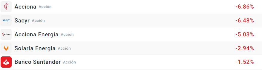 Prácticamente todas las empresas que componen el índice caen, con excepción de Merlin, aunque lo hace ligeramente. Por la parte de las caídas tenemos hechos reseñables. Acciona y Acciona Energía caen con mucha fuerza, debido a una rebaja de expectativas con respecto a su Ebitda por parte de la propia empresa, debido a los bajos precios de la luz. Por su parte, Sacyr hace lo propio después de que ayer ampliara capital por 200 millones de euros o un 9,6% de capital.