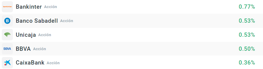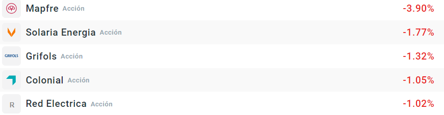 Poco que destacar en la parte alcista de la tabla, con la banca al completo teniendo un buen inicio y copando prácticamente todos los primeros puestos. En las caídas hay que señalar que la de Mapfre se debe al dividendo, que se repartirá el viernes pero que hoy ya cotiza ex dividend. Solaria sí que sigue acusando las noticias de ayer, con aumentos de cortos y bajadas de precios objetivos. Grifols vuelve a copar la parte baja de la tabla.