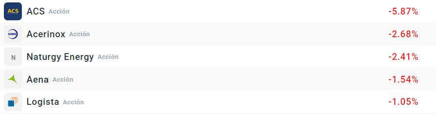 A nivel empresarial, Grifols sigue siendo la protagonista con una subida vertical después de las caídas de ayer. Puedes conocer todas las novedades de Grifols en nuestro apartado de noticias. Le siguen Amadeus y Acciona, que también caían ayer con fuerza, por lo que vemos importantes rebotes. En la parte bajista de la tabla, ACS cae con fuerza, tras presentar ayer unos resultados que no están convenciendo al mercado. Le siguen Acerniox y Naturgy, que están sufriendo la ciclicidad de sus sectores.
