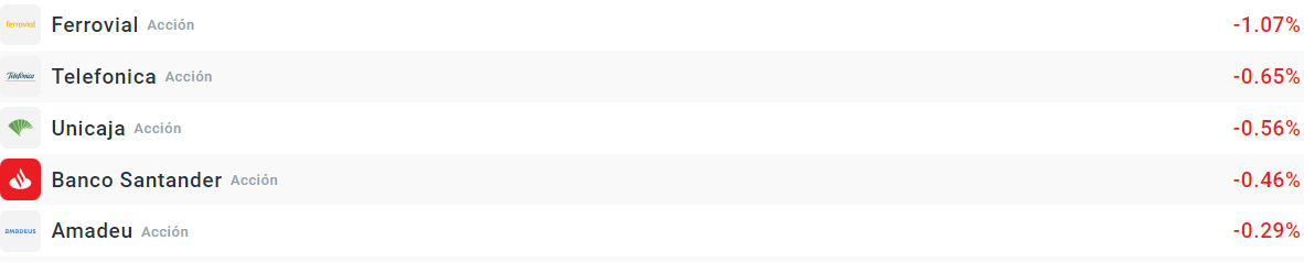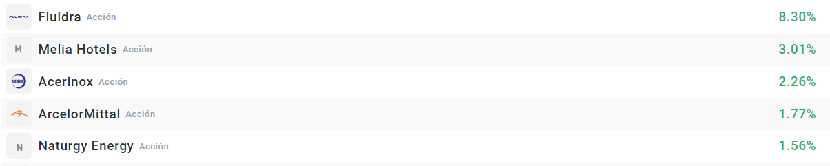 La parte alcista de la tabla está liderada por Fluidra, que ha recibido un aumento de precio objetivo por parte de una conocida casa de análisis. Meliá y Acerinox también suben con fuerza. Las caídas son reducidas, pero tenemos que señalar a Ferrovial y Telefónica. La primera empezó a cotizar en Estados Unidos con mucha volatilidad justo ayer, mientras que la segunda presentó unos resultados muy pobres.