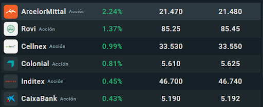 Entre los valores más destacados por el lado de las subidas se encuentra ArcelorMittal, que se vio impulsado por los buenos datos de exportaciones en China. Le siguieron Rovi, Cellnex y Colonial. Por el lado de las caídas, cierran la tabla Red Eléctrica, Ferrovial e IAG, que hoy recibió un recorte de precio en un informe de una banco de inversión.